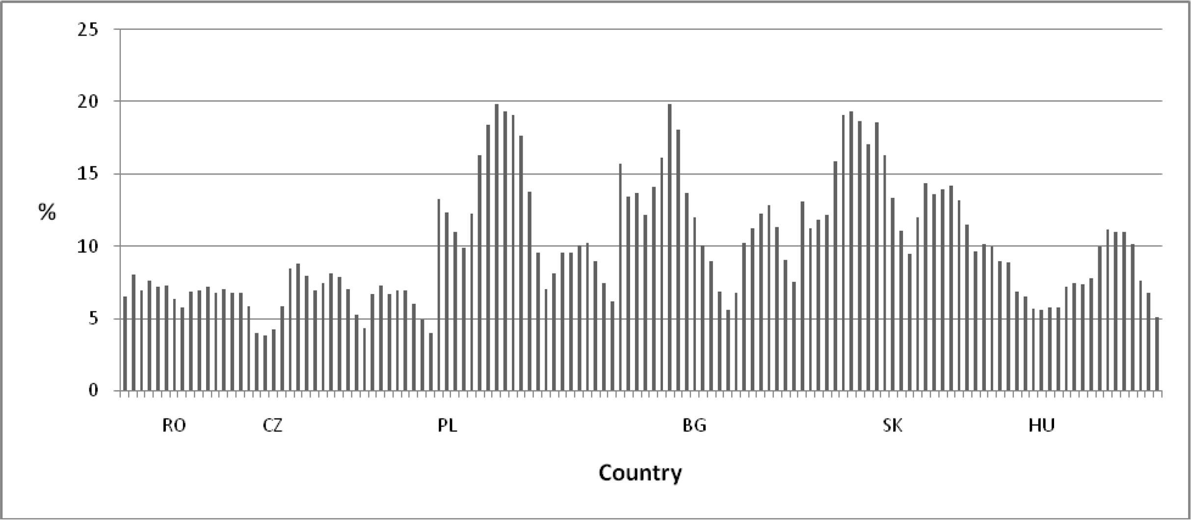 The unemployment rate (Figure 5) remains higher in Slovakia and Bulgaria with lower levels in the Czech Republic, Hungary and Romania. The unemployment stance can be explained, largo sensu, by the rigidities in the labour market that include a high degree of employment protection and wage bargaining systems that are not supportive of flexible wage adjustments. Nevertheless, unemployment is a more complex issue that needs detailed argumentation in the context of each country including considerations on the welfare system and brain drain.