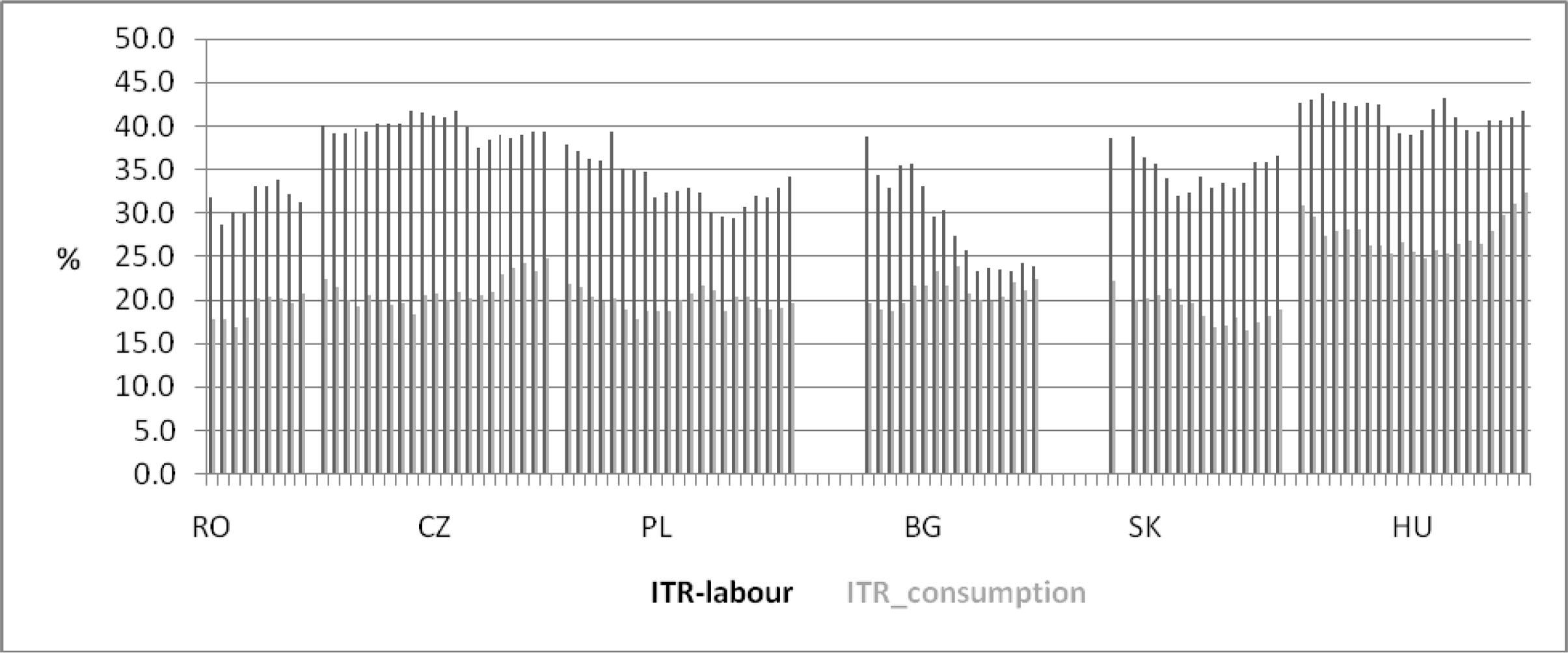 The ITR on labour and the ITR on consumption are described in Figure 6. The evolution, consistent with literature, shows that the ITR on labour are higher than the ITR on consumption in the entire group of countries, reflecting consumption driven economies. The highest ITR on labour is in Hungary and the Czech Republic and lowest in Bulgaria; meanwhile the ITR on consumption are more harmonised, following the EU trend.
