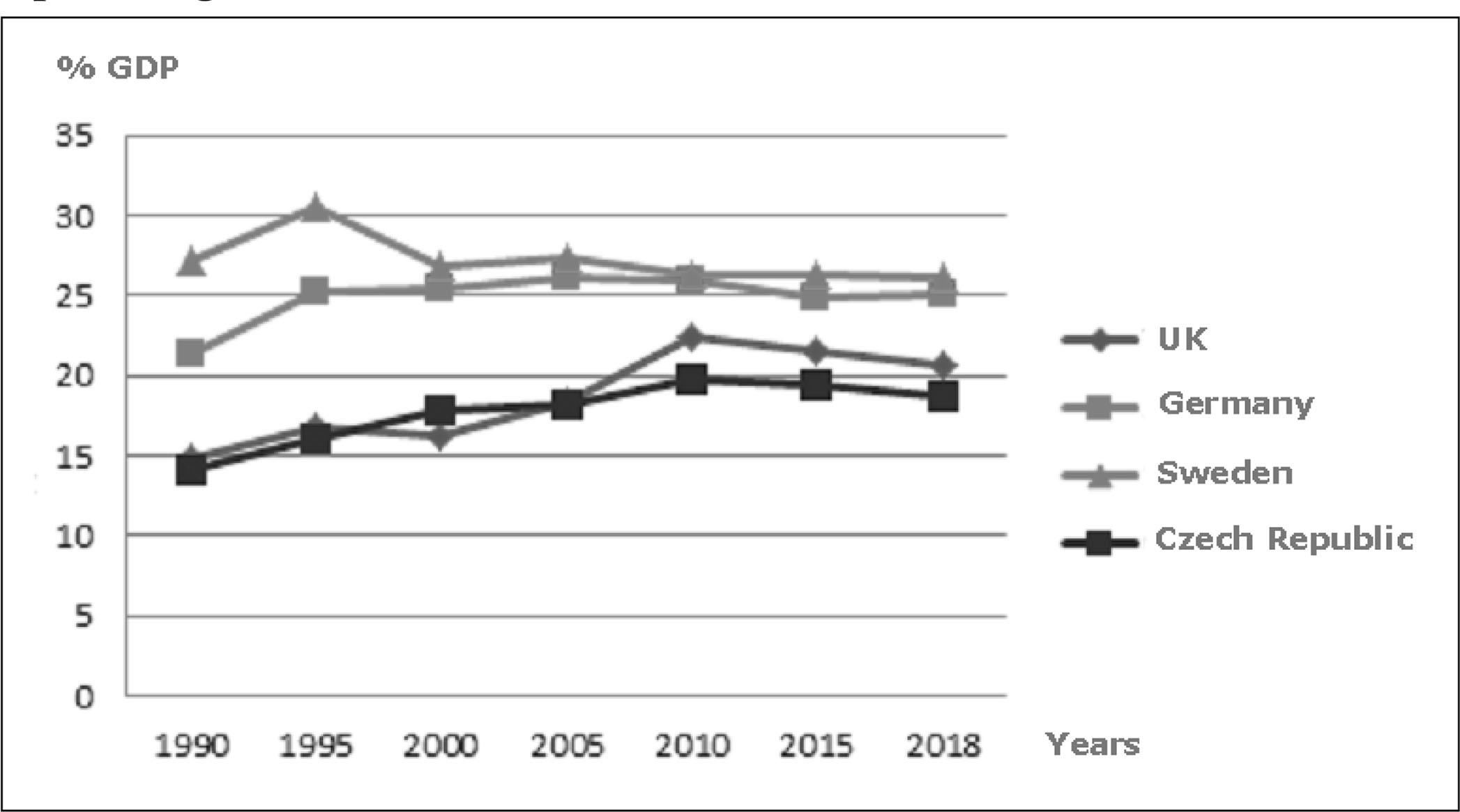 Table 1 outlines the characteristics of the welfare residual state, represented by the United Kingdom, the performance welfare state represented by the Federal Republic of Germany and the institutional welfare state represented by Sweden. Let us now compare the selected social spending of these countries between 1990 and 2018 with the social spending of the Czech Republic.