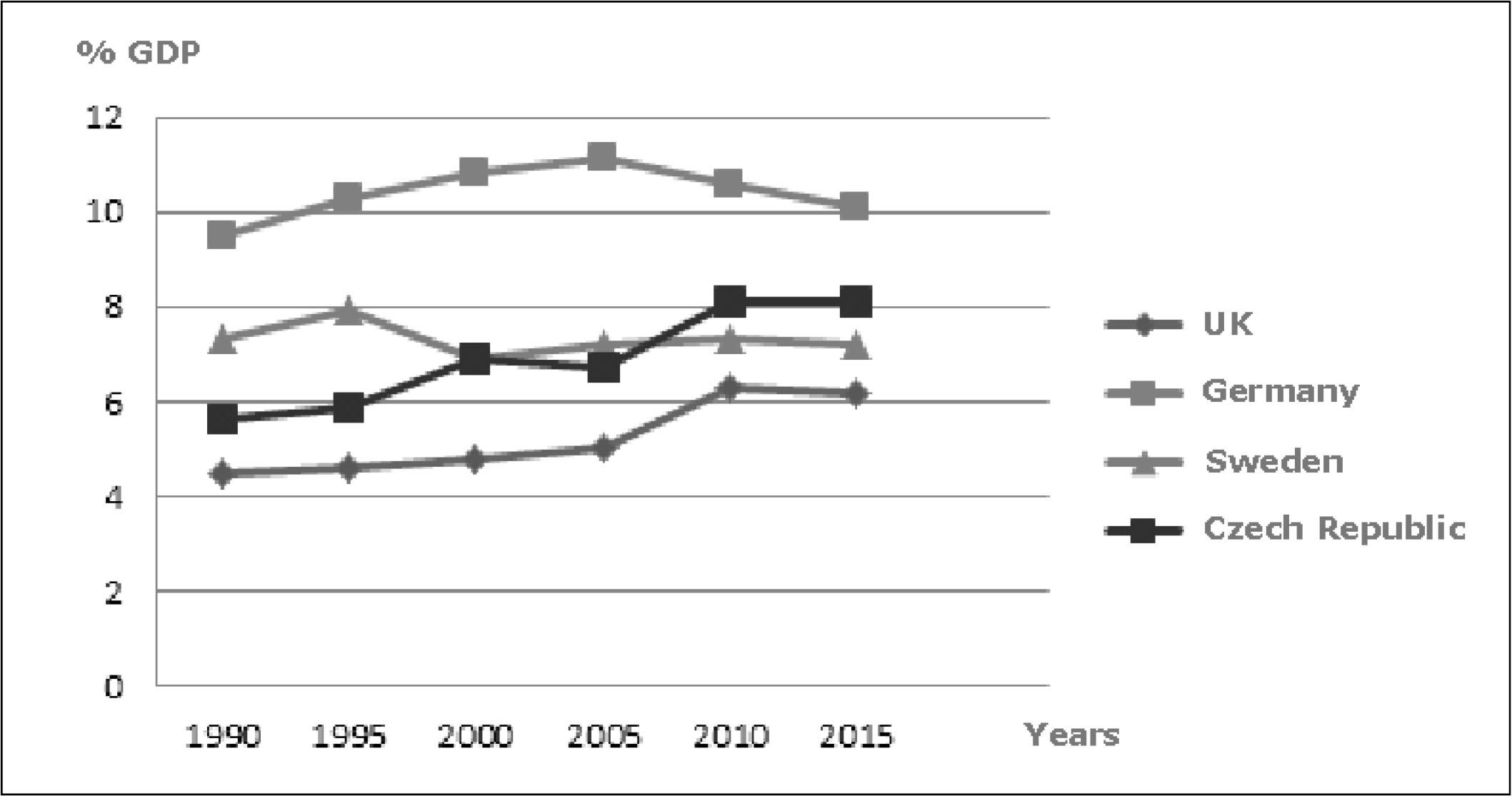 Summary public expenditure for old-age and survivors’ pensions, expressed as a percentage of GDP, is shown in Figure 2. This graph also shows a similar trend of these expenditures in the United Kingdom and the Czech Republic, again with the exception of 2000 when the spending of Sweden and the Czech Republic came closer together.