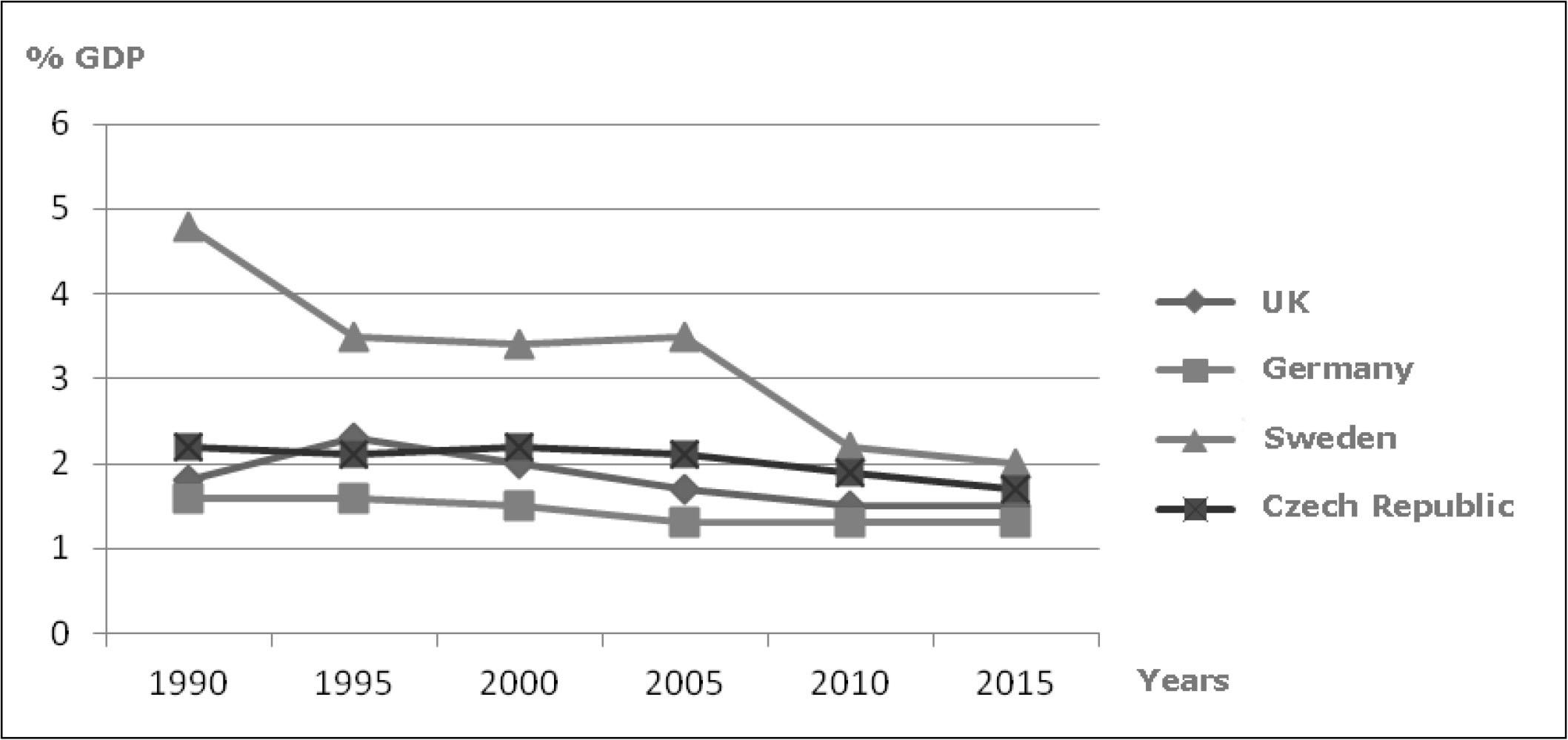 Total public expenditure for families as a percentage of GDP is shown in Figure 4. This clearly shows that the United Kingdom and Sweden differ from the rest of the countries throughout the entire monitored period.