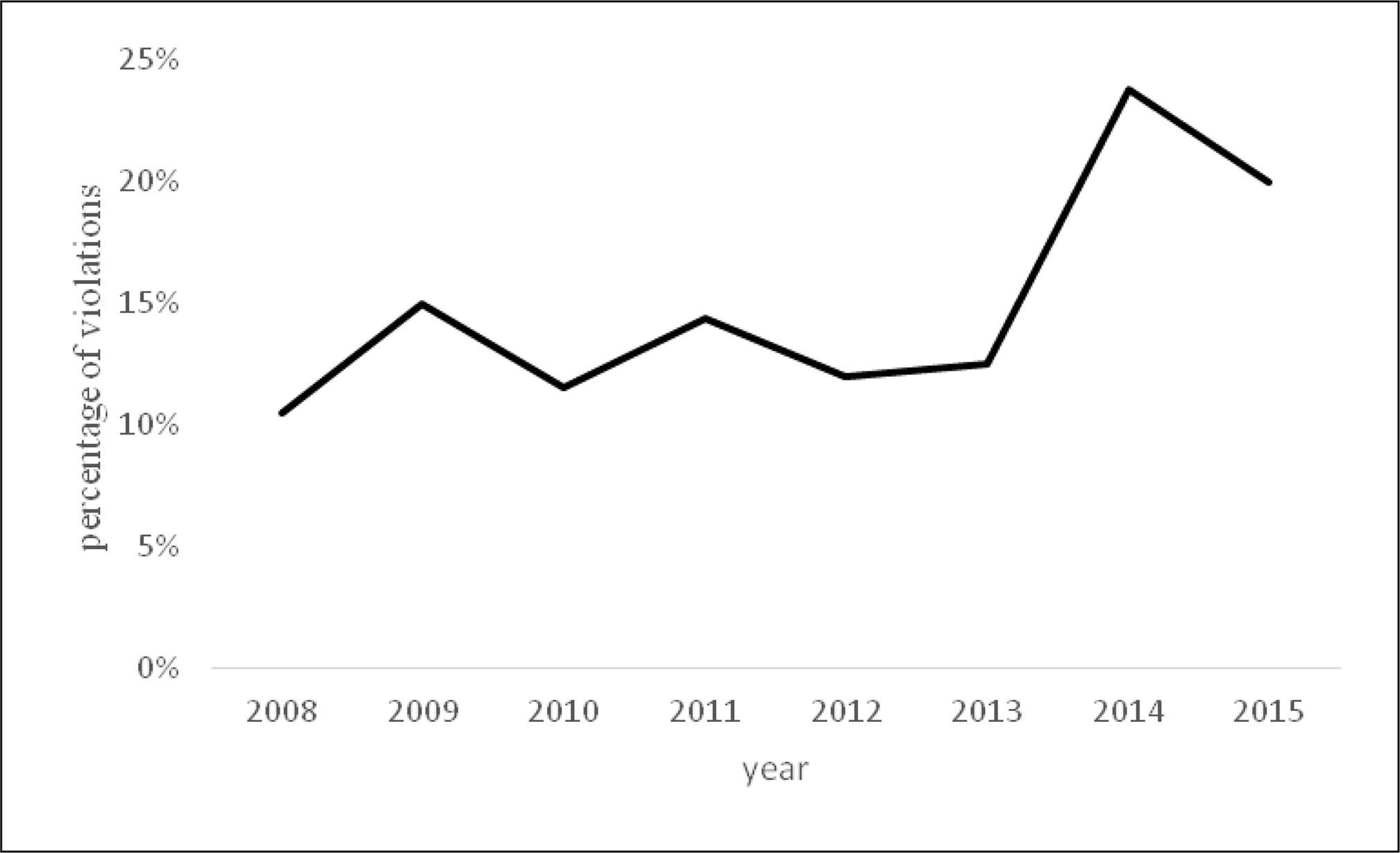 | No. of violations | 5 | 6 | 4 | 8 | 7 | 4 | 5 | 4 | 43 |