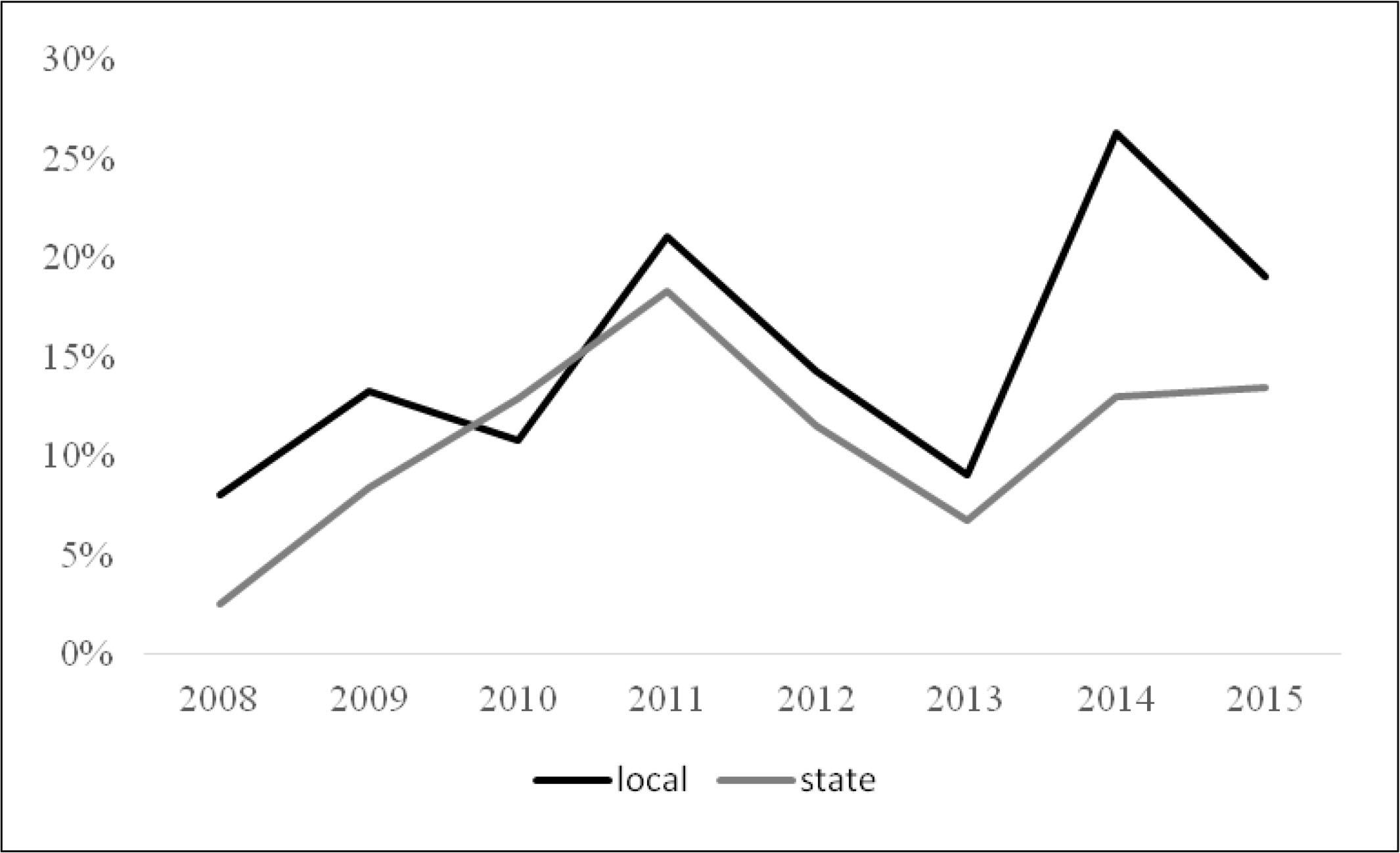 Proportion of violations of the principle of transparency at the state and municipal levels by year