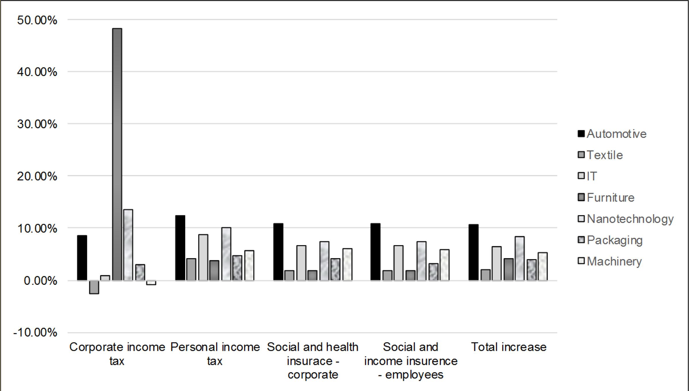 The development of individual sources from which taxes and insurances are paid to public budgets is shown in Figure 1. The biggest differences between cluster organizations were found in corporate income tax. The significant increase in corporate tax paid by members of the furniture cluster was accounted for in the text above. Taxes collected from members of this cluster grew at an average rate of 48% per year. On the contrary, in the textile cluster, it decreased by almost 3% per year on average. The decline in the rate of the collection of corporate tax, albeit very low (on average less than one per cent per year), was also identified for members of the engineering cluster. Nevertheless, there was a considerable year-on-year fluctuation in the collection of corporate tax for the engineering cluster and, unlike the textile cluster, the sum of increases in the collected tax was positive for the whole 2007–2013 monitored period. The other three sources – natural person income tax, social security and health insurance paid by employers and employees – are dependent on the amount of labour costs and therefore follow the same trend. A more significant increase in these sources was recorded in three clusters – automotive, IT and nanotechnology, on average between 9% and 12% per year.