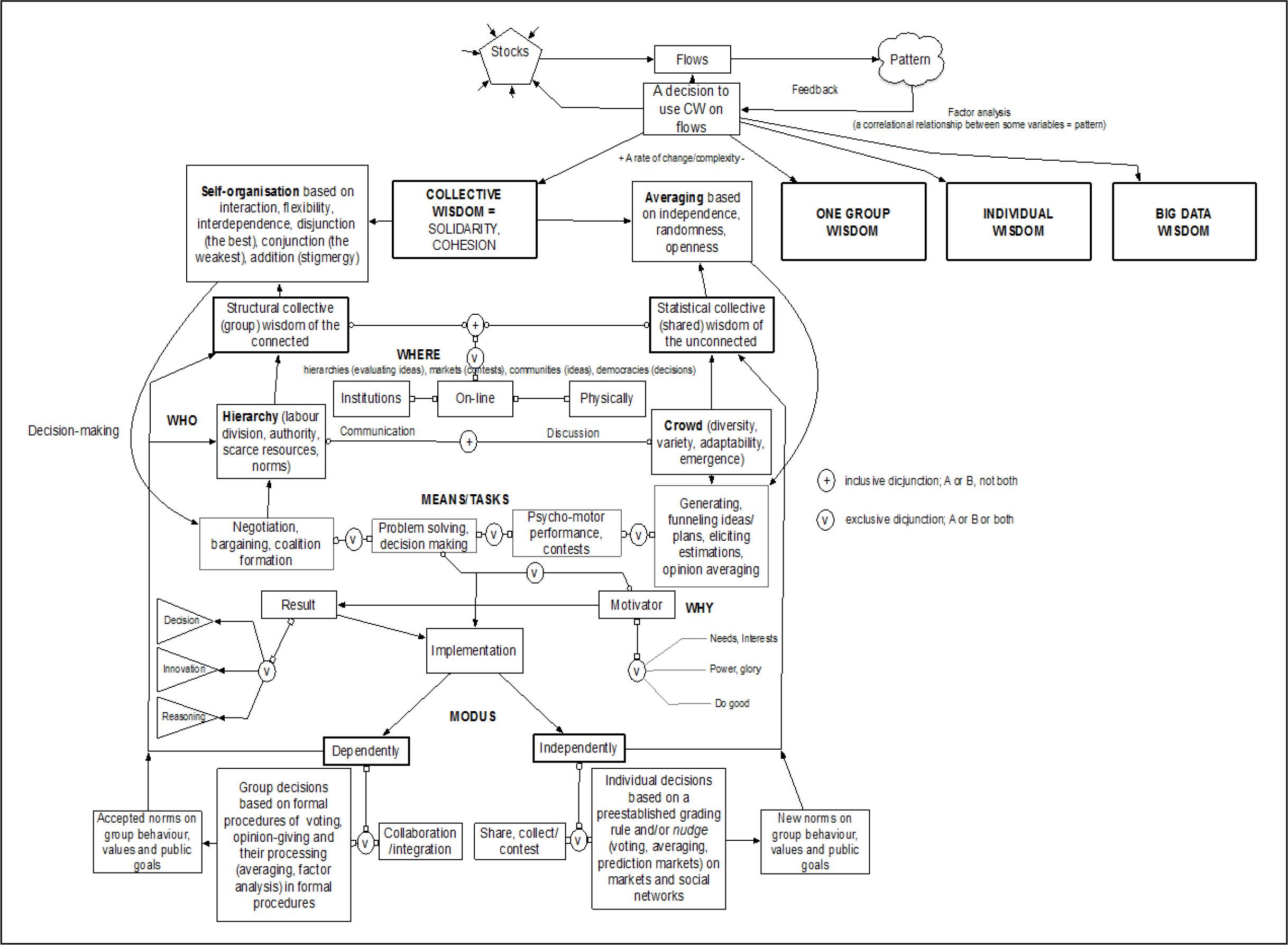 There are a) simple, b) complicated and c) more complicated ways to harness CW: a) and b) can be made from the unconnected individuals, who (independently and without knowing each other's answers) provide data for other purposes (in the open databases) or to solve a specific problem, while the more complicated ways can be made with the connected individuals, who act with a certain degree of mutual dependency (from the most loose connection, where results of others are seen [which can affect decisions of the later opinion-givers], to the more connected (where social ability comes to the fore) and the most connected, where the later opinion-givers mimic the previous ones. The options a) and b) are based on data aggregation and statistical analysis, while c) results in self-organisation processes. The examples of a/b/c are the open data (portals)/public forums/communication (via pheromones of mimicking insects) that gives and changes weights of given alternatives. These options circulate the notions of ‘social machines’, ‘social computing’ as a crowdsourced media reports on public problems (Shadbolt et al., 2019) or ‘social collective intelligence’ as a mix of CW and social informatics (Miorandi et al., 2014) that includes the ideas of hybrid computing (people and machines working together to create new types of problem-solving ability, from peoples’ everyday use of their mobile connection to data, algorithms and social networks), adaptivity and learning (gaining knowledge of how the system responds to different circumstances and using that to readapt). One of such examples is the Smart Society project (Smart Society Project, 2017) as a socio-technical ecosystem, in which the physical and virtual dimensions of life are intertwined and where people interact. All alternatives of CW could serve as an input for flows that together with the stocks, patterns and feedback represent the system (the upper part in Figure 1). CW could be the answer on the question on ‘[h]ow much energy and creativity might be unlocked if all people in an organization feel in control’ (Malone, 2003, p. 63)? Regarding the implementation steps, the government could establish different public platforms on which the people could provide their opinions on public matters. This citizen-centred approach could reframe discussion between autonomy and paternalism towards the shared decision making, collaboration or the calibration of public interest according to the citizen's inputs, towards partnerships among the public institutions, citizens and communities. Such an approach could promote practices that will more likely nurture CW than simply proclaim the principle of autonomy.