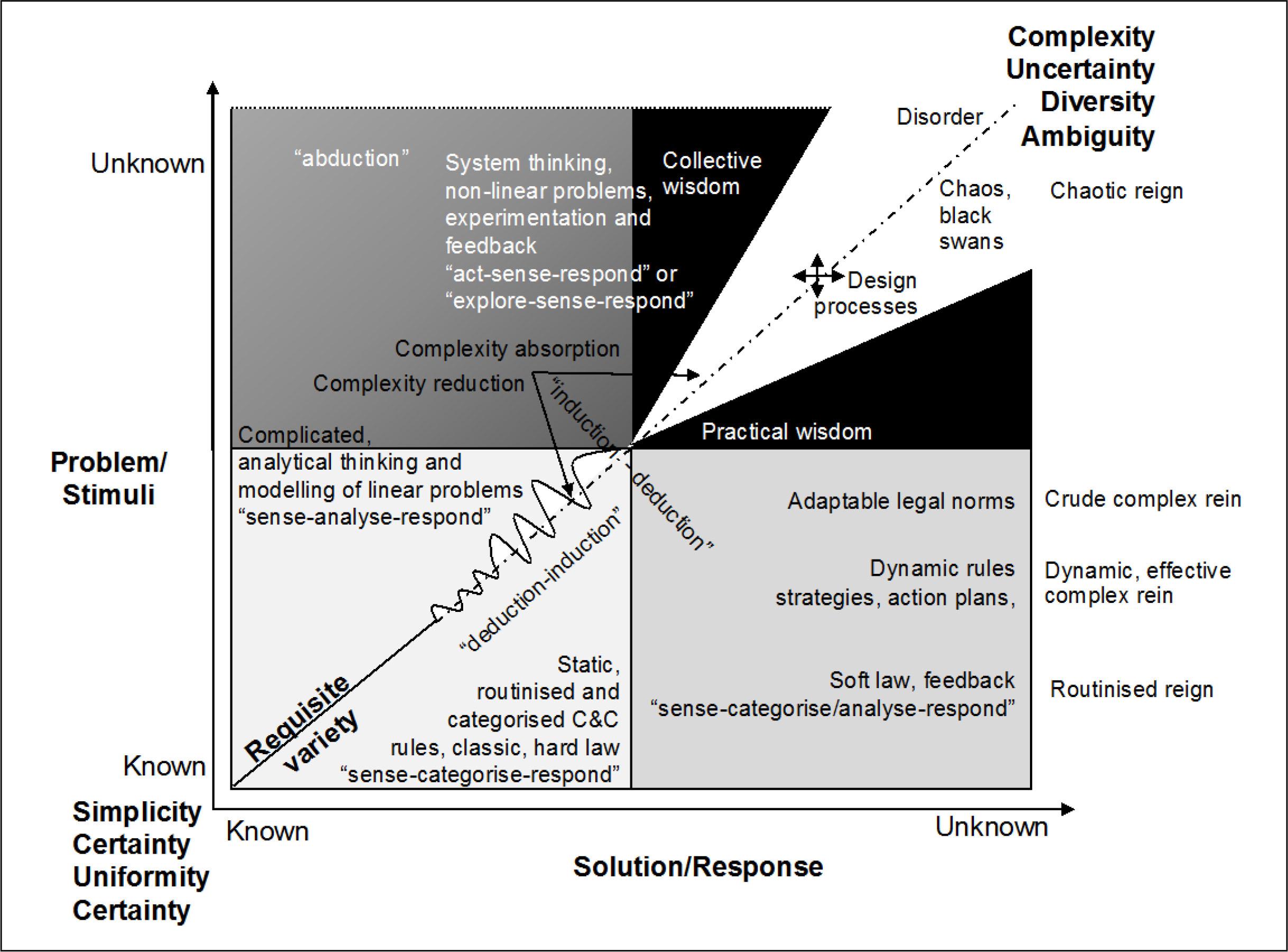 The environment evolves in its own (systemically-interconnected) ways, and it does not consider formal (democratic) decisions automatically. The latter must hence address the first accordingly with the similar level of complexity: simple rules for the known environment, dynamic or adaptable norms for the dynamic environment, systemic rules for the complicated environment for CW for the complex environment.