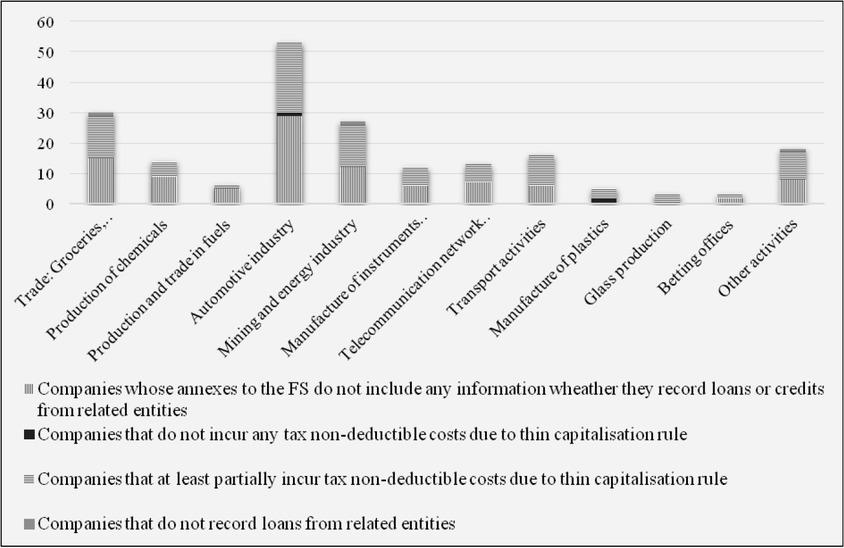 In Figure 2, we split the companies into individual economic sectors. The largest companies in the Czech Republic are mainly in the automotive, mining and energy sectors, and also in the trade in food, beverages, etc. For the main sectors of the economy, about 50% of the companies do not record loans and about 50% of the companies register loans but do not incur tax non-deductible costs. Two companies (of the total of five) in the plastics sector register tax non-deductible costs due to the thin capitalisation rule. This finding is interesting when compared to the other sectors. For further research it could be valuable to focus on the plastic manufacturing companies and to find out, if they are more likely to have the ratio of less than 1 or whether this research result is merely due to some other random events, relevant to the two particular companies and not to the field as a whole.