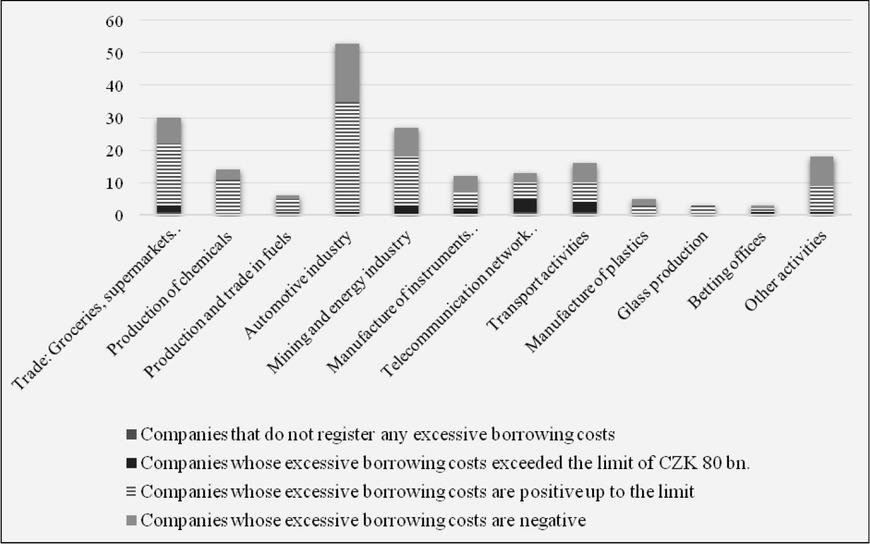 In Figure 4, we provide an overview of the results split into individual sectors of the economy. The threshold of CZK 80 bn. was exceeded mainly by the companies operating in the fields of telecommunications services and transport. Several companies were also active in the mining and energy industries and in the sector of food, beverage and similar. Interestingly, only 1 company of the total of 53 automotive companies exceeded the limit of CZK 80 bn. This is also because many of these companies realized higher borrowing revenues than borrowing expenses. Several companies have also reported negative excessive borrowing costs, mainly those active in the extractive and energy industries, food and beverage, and other activities.