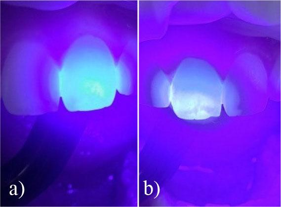 LED light source applied to the palatal aspects of incisors to assess the depth of the white spot lesions, verified through its sharpness. a) Tooth 11; b) Tooth 21.
