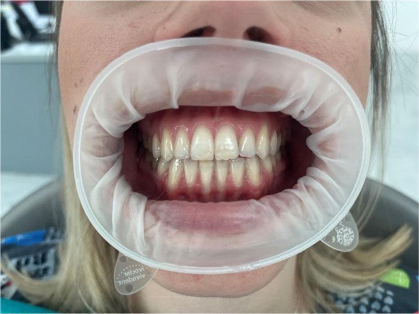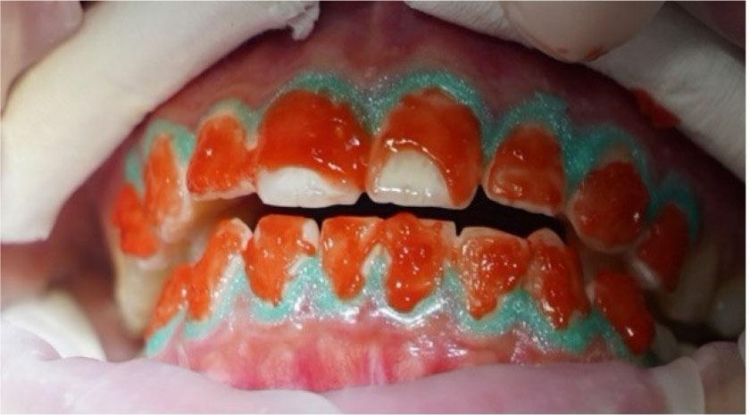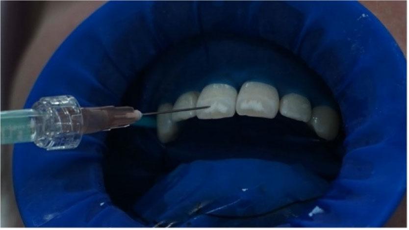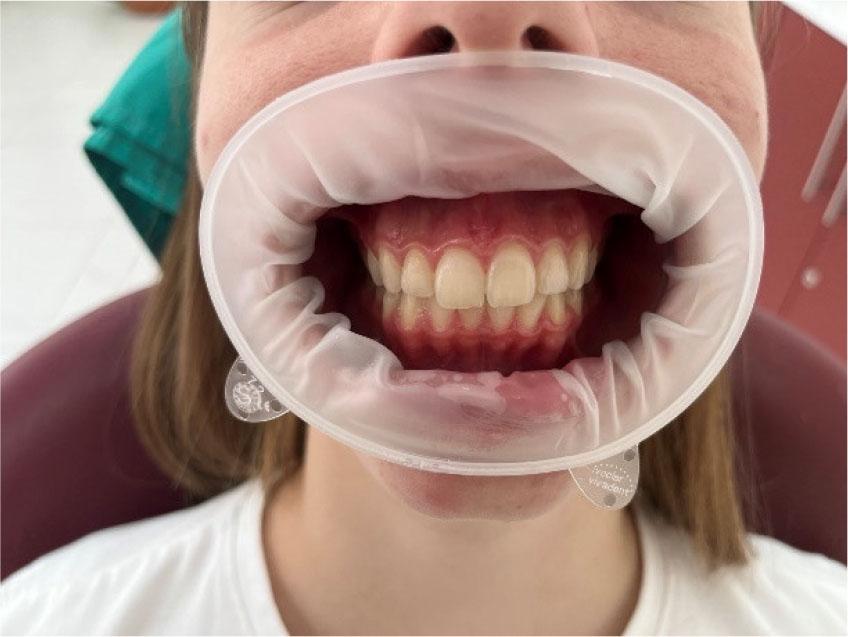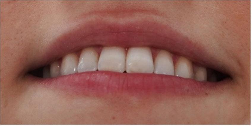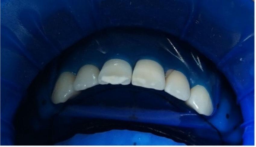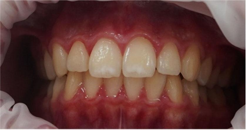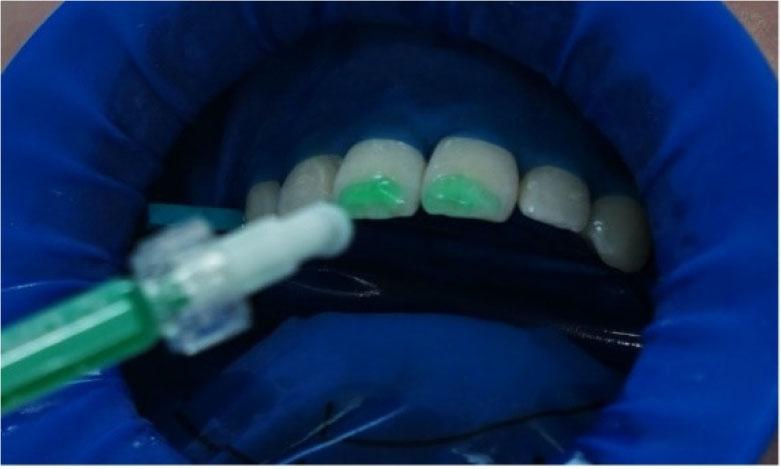 First, the soft tissues of the patients were protected with an oral self-supporting lip/cheek retractor (Ultradent Umbrella™ retractor, Ultradent Products Inc, South Jordan, USA). A gingival barrier, using a light-polymerized resin dam (Opal Dam, Ultradent Produtos Inc, South Jordan, UT, USA) was applied to the gingival outline between the first upper right and left premolars in order to prevent any mucosal irritation or injury (Figure 3). Next, the bleaching gel was applied, without involving the white spots, for 20 minutes. The gel was aspirated, the teeth were washed with abundant water and the gingival barrier was removed. There were no sensitivity and inflammation in her soft tissues after the treatment. The procedure was repeated after 1 and 2 weeks respectively. The patients were informed that a period of 3 weeks was necessary between the bleaching sessions and the resin infiltration procedures.