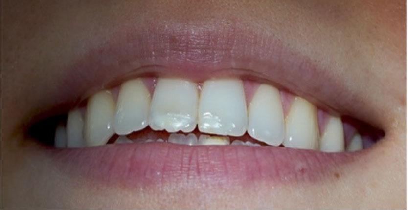 Extraoral view of initial aspect of enamel hypoplasia. White spots in the incisal margins of teeth 11 and 21 observed.