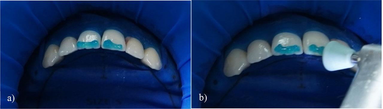 a) Procedure performed manually with a wooden wedge/spatula and 37% phosphoric acid + pumice stone. b) Microabrasion performed with rotating instrument: rubber cup associated with 37% phosphoric acid paste + pumice stone.