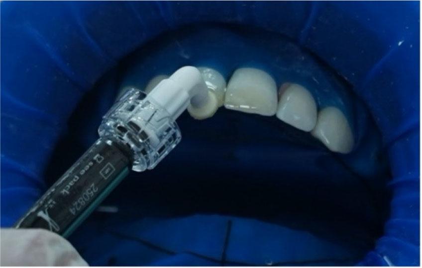 In the last session, a resin infiltrant (Icon, DMG, Hamburg, Germany) was used to further enhance the appearance of the white patch that remained after the microabrasion. The procedure was performed on the same day as the last microabrasion session according to the manufacturer's instructions. After isolating the teeth with the rubber dam, 15% hydrochloric acid gel (ICON-Etch; DMG, Hamburg, Germany) was applied for 2 minutes specifically over the enamel surface of the affected teeth to remove the surface layer less than 30 to 40 μm (Figure 6 and 13). After acid etching, the area was washed for 30 seconds and air dried with the air-water syringe for 15 seconds. According to the protocol, three Icon-etch applications were required.