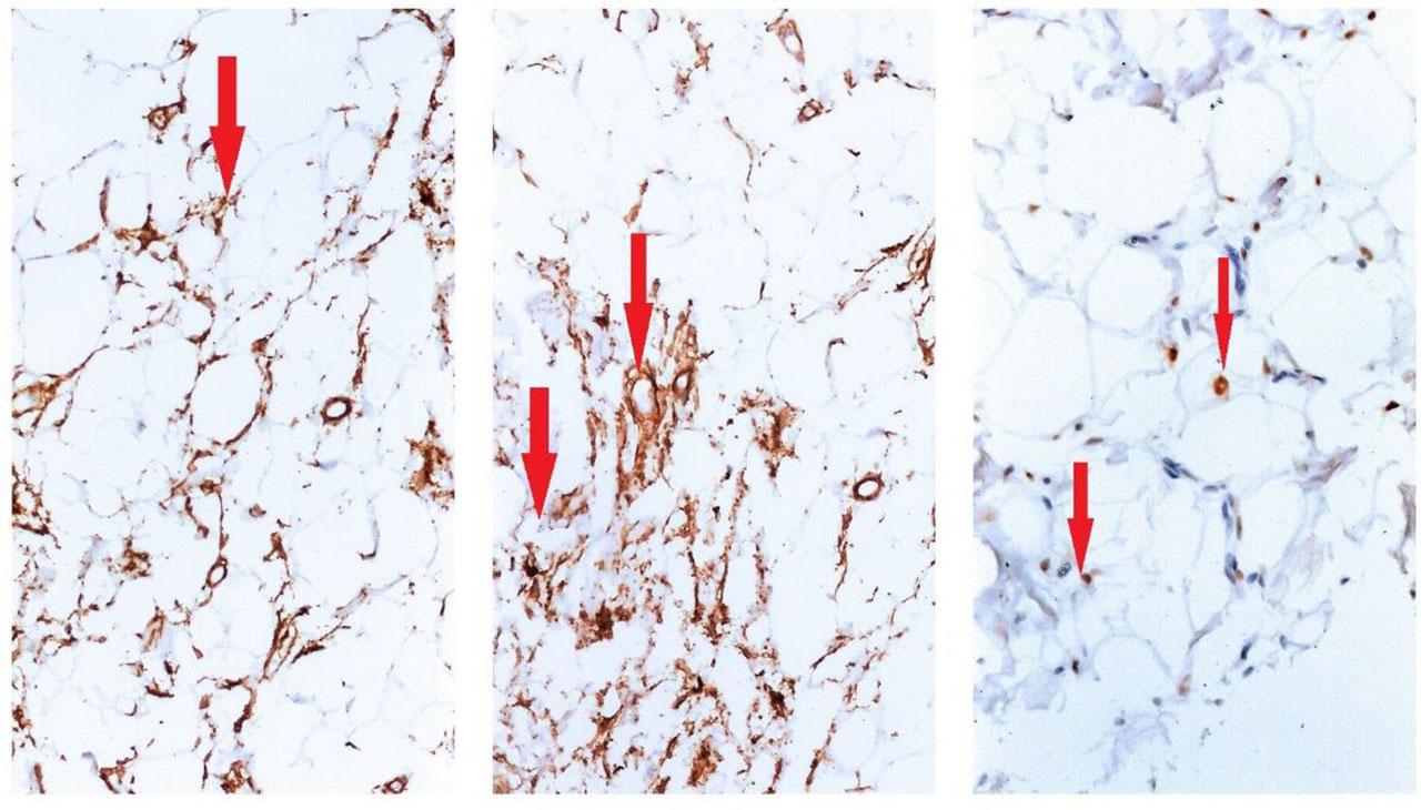 The relative number of cells expressing CD44+, CD166+, SOX9+ in the biopsy material of infrapatellar fat pad (IPFP) and abdominal subcutaneous adipose tissue (SCAT)
