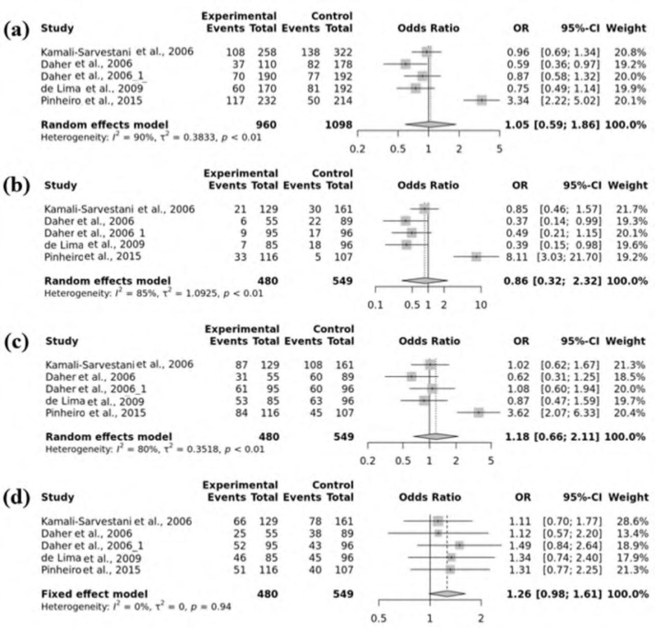 | Pinheiro et al., 2015[15] | Caucasian | Brazil | 33 | 51 | 32 | 5 | 40 | 62 | 0.6497 | 0.8776 | 7 | |