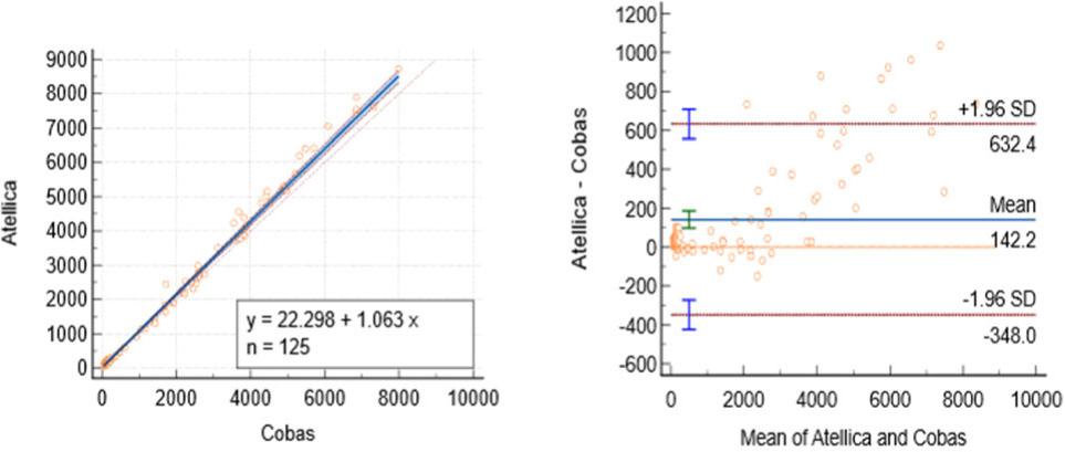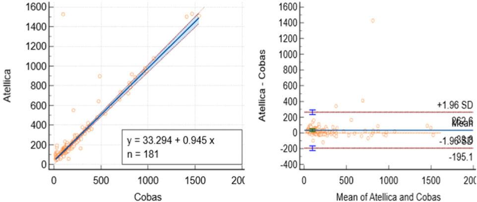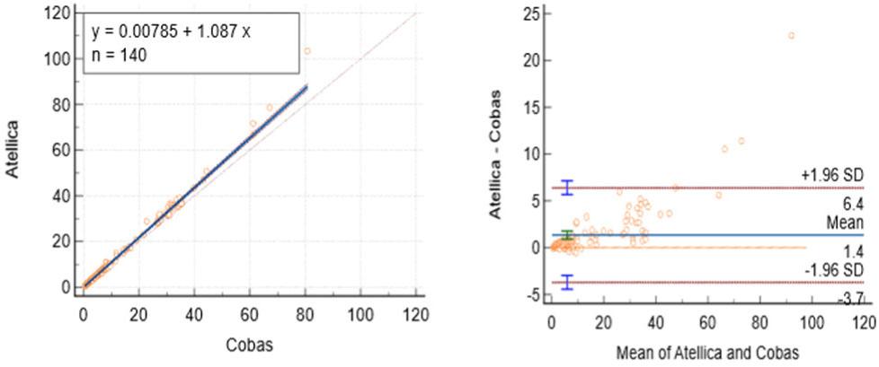 | Estradiol (adult) | 0.968 | 22.30 (13.66 to 29.11) | 1.06 (1.04 to 1.08) | +142.18 pmol/L (97.91 to 186.46) | p = 0.05 | Substantial overestimation on Atellica |