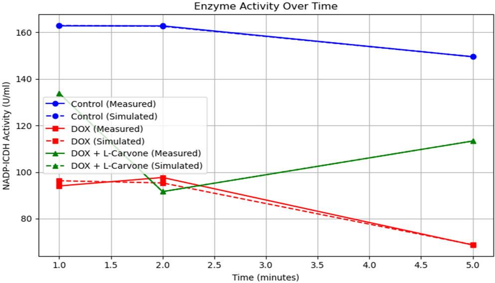 Comparison of Simulated NADP+-Dependent Isocitrate Dehydrogenase (IDH) Time-Course Data and Estimated Data Activity Over Time Under Different Treatment Conditions.