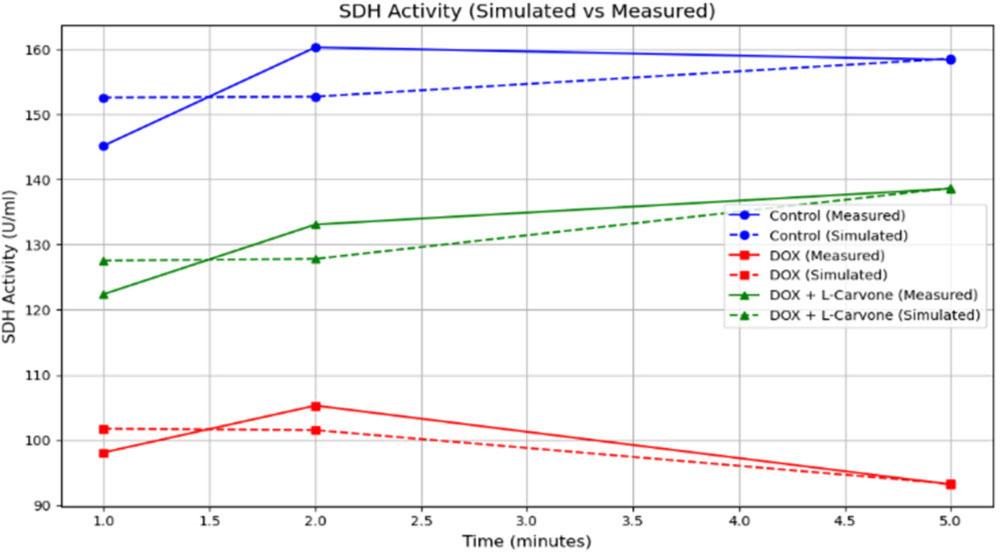 Comparison of Simulated Time-Course Data and Experimentally Estimated Data of Succinate Dehydrogenase (SDH) Activity Over Time Under Different Treatment Conditions.