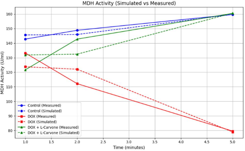 Comparison of Simulated Time-Course Data and Experimentally Estimated Data of Malate Dehydrogenase (MDH) Activity Over Time Under Different Treatment Conditions.