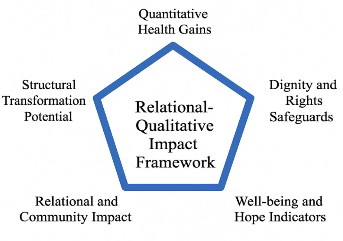 One potential way forward is to rethink the metrics at the core of EA, particularly Disability-Adjusted Life Years (DALYs) and other cost-effectiveness tools, through the lens of CE. These measures can be supplemented with what I propose as a Relational–Qualitative Impact Framework (RQIF). This framework aims to balance efficiency with relational, ethical, and experiential values. It retains quantitative health gains as an important dimension but adds a rights-based safeguard to ensure that interventions do not jeopardize basic human dignity. Additionally, it incorporates indicators of well-being and hope, such as patient-reported outcomes, to highlight lived experiences of resilience, trust, and dignity. The framework also considers relational and community impacts, asking whether interventions strengthen or undermine social bonds and care infrastructures. For example, community-led HIV care centers may appear less cost-effective than large prevention campaigns when viewed through the lens of DALYs; however, they build trust, empower local actors, and ensure continuity of care, which are essential for long-term success. Finally, the framework evaluates the potential for structural transformation, distinguishing between temporary relief and deeper systemic change. A diagram illustrating the framework follows below: