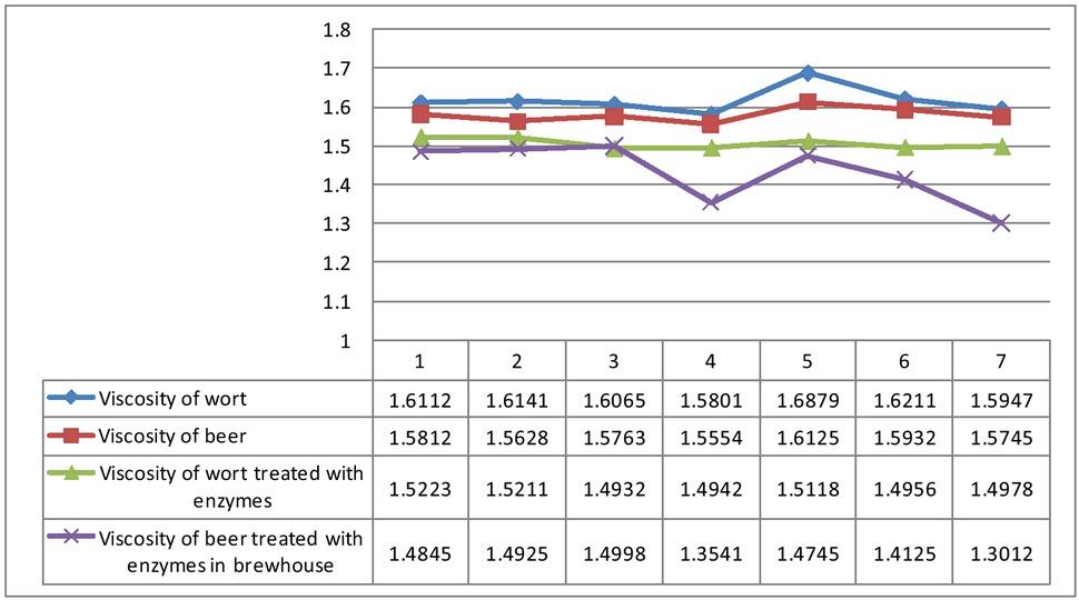 Viscosity in worts and beer treated in different manner with enzymes.