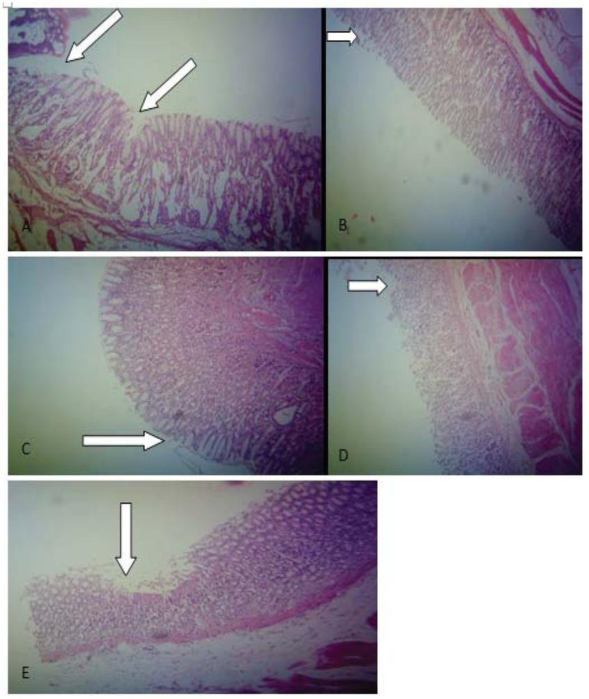 Stomach sections of effects of ESE against indomethacin-induced gastric ulcer. Arrows indicate points of gastric ulceration. Plates A- E represents various treatments; groups A = distilled water 5.0 ml/kg, B = cimetidine 100 mg/kg, C = ESE 25 mg/kg, D = ESE 50 mg/kg, E = ESE 100 mg/kg (x 100 magnification).