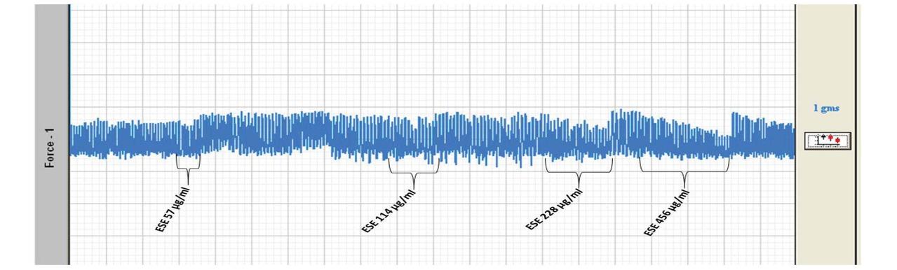 The relaxant effects of ESE on isolated rabbit jejunum ex vivo ESE = Eremomastax speciosa extract, final bath concentration of ESE ranged between 57 – 456 μg/mL.