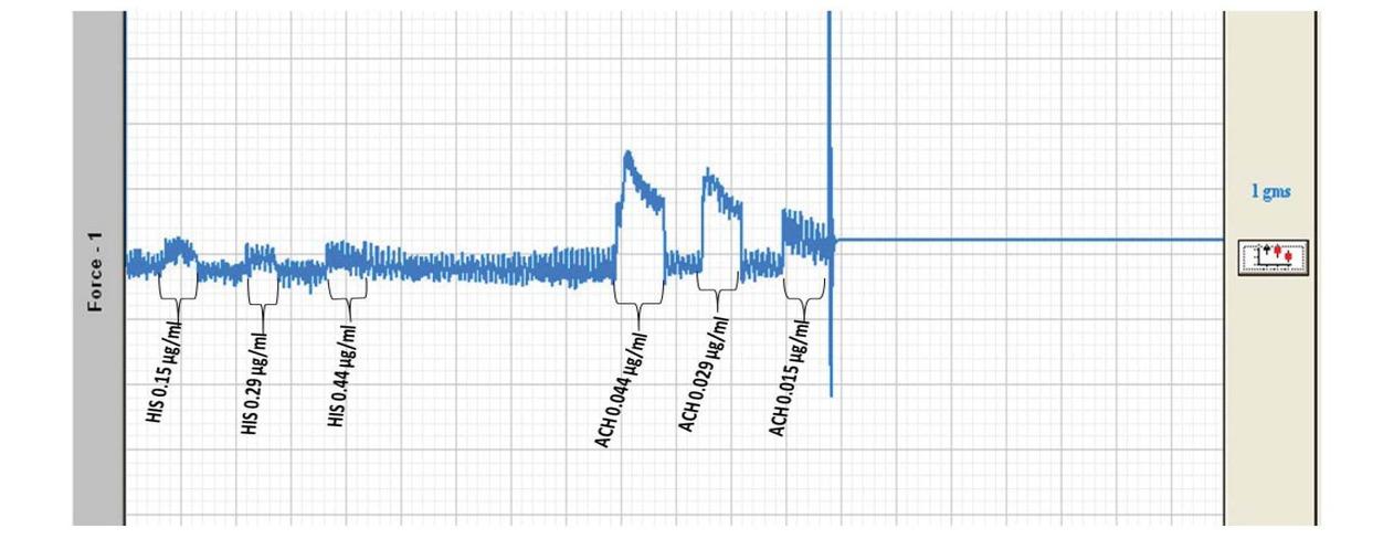 Concentration-dependent effects of histamine and acetylcholine on the intrinsic contraction in isolated rabbit jejunum ex vivo HIS = histamine, ACH = acetylcholine, the final bath concentration of histamine was between 0.15 – 0.44 μg/mL while the final bath concentration of acetylcholine was between 0.015 – 0.044 μg/ml.