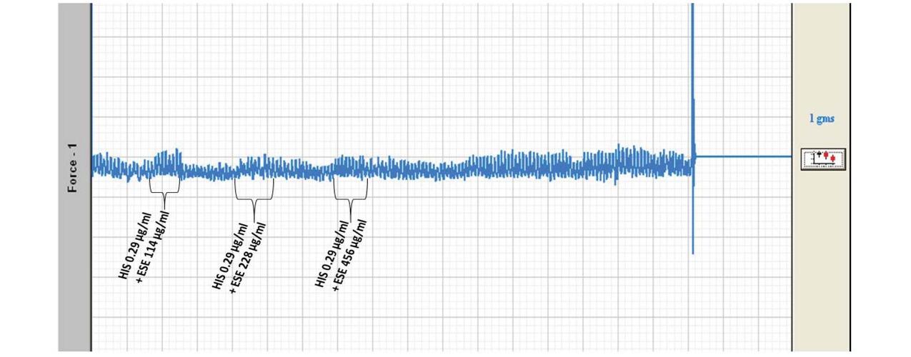 The inhibitory effects of ESE on histamine-induced increased intrinsic contraction of isolated rabbit jejunum ex vivo HIS = histamine, ESE = Eremomastax speciosa extract, the final bath concentration of histamine was 0.29 μg/mL while the final bath concentration of ESE ranged between 114 – 456 μg/mL.