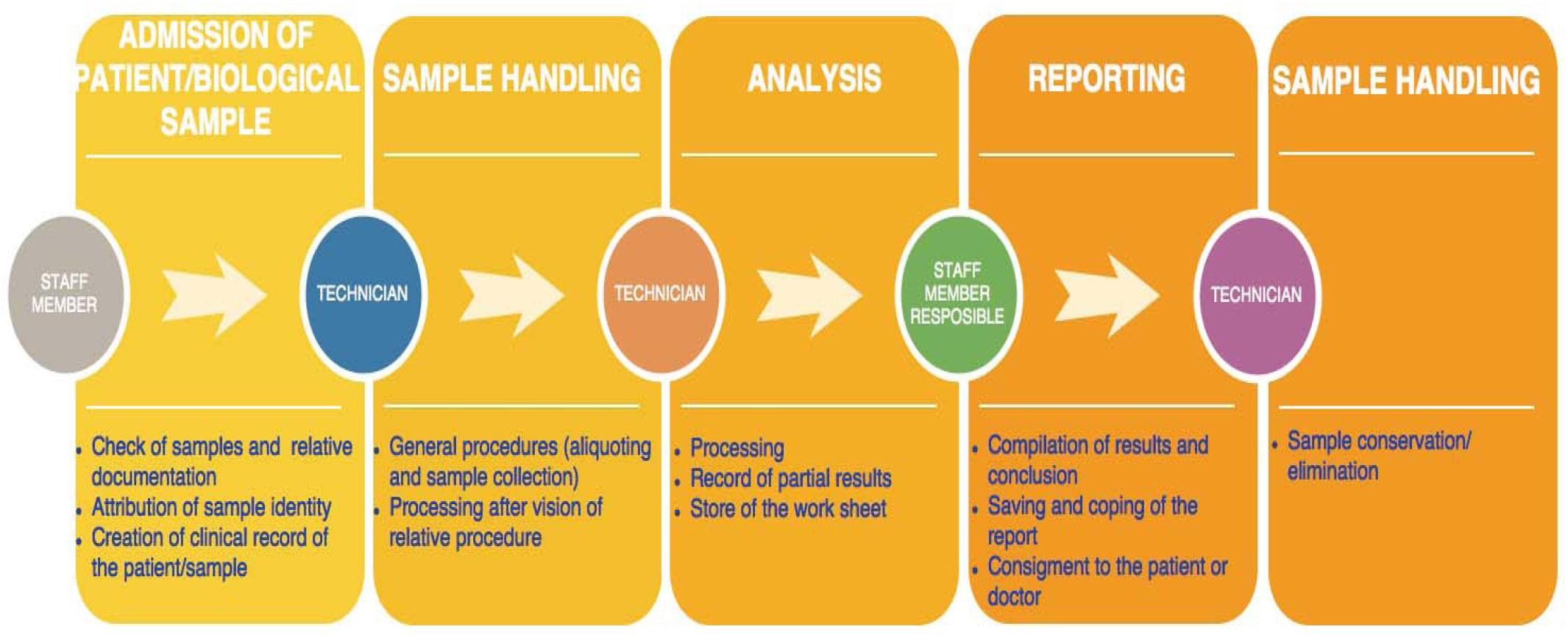 Quality assurance (QA) is crucial to maintaining the highest quality standards in genetic testing laboratories. The QA is based on two tools: process control and quality statistical control (www.bayes.it) In a clinical laboratory the process control coincides with the control of sources of analytic variability, so that it has an accurate end result. The outcome of a laboratory test results from a “variability” factor related both to laboratory activities (preanalytical, analytic and post analytical variability) and to the subject itself (inter-individual and intra-individual biological variability) that result in a total variability that causes each laboratory data to be affected by a greater or lesser extent of error. The preanalytical phase comprises test selection and specimen collection, processing, handling, and delivery to the testing site; the analytic phase includes selection of test methods, performance of test procedures, monitoring and verification of the accuracy and reliability of test results, and documentation of test findings; The postanalytical phase includes reporting test results and archiving records, reports, and tested specimens (7). Errors are very likely to emerge during the pre-analytical phase and post-analytical phases (8). The statistical approach is helpful for the QA, it is based on the fact that the measurement errors are distributed according to the Gaussian model, therefore, once a maximum error tolerance limit has been established, the error can be detected and reported within the tolerance limits (9). The automated analysers are capable of producing multiple results in a short time through the incorporation of robotics and bioinformatics. However, statistical quality control is difficult to monitor due to the large number of samples analysed (10). Furthermore, the implement of new technologies, e.g. Next Generation Sequencing, requires an optimal standardization for the reduction of errors in medical laboratories (11,12).