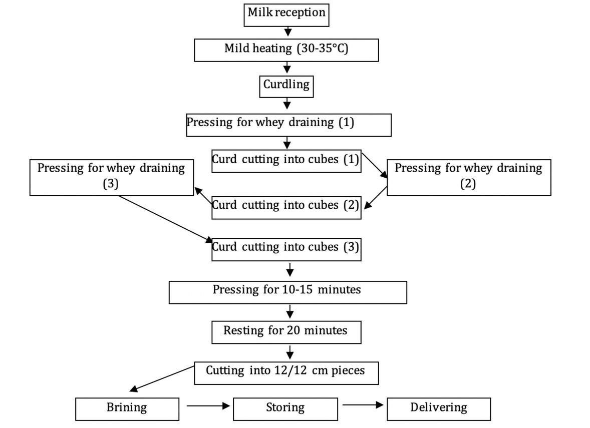 Traditional Romanian soft brined cheese manufacture diagram.