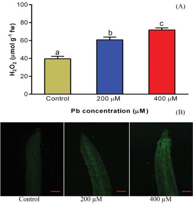 alization in the root tissue clearly indicates the dose-dependent production of H2O2 upon treatment with Pb (Fig. 5A). Confocal results revealed that maximum fluorescence was observed at 400 μM Pb-treated root followed by 200 μM which signify maximum production of H2O2, while no fluorescence was seen at control (Fig. 5B). This data is corroborated with the H2O2 results obtained spectrophotometrically.