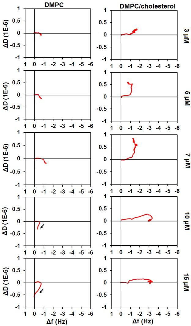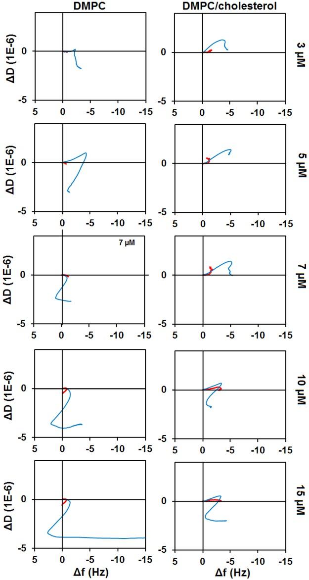 ΔD vs Δf plots of aurein1.2-NH-CH3 interaction with DMPC and DMPC:cholesterol (9:1) membranes at different concentrations. The effect is shown for the seventh harmonic of the fundamental frequency of the sensor chip.