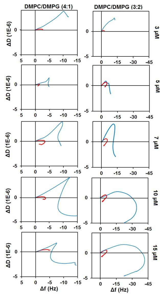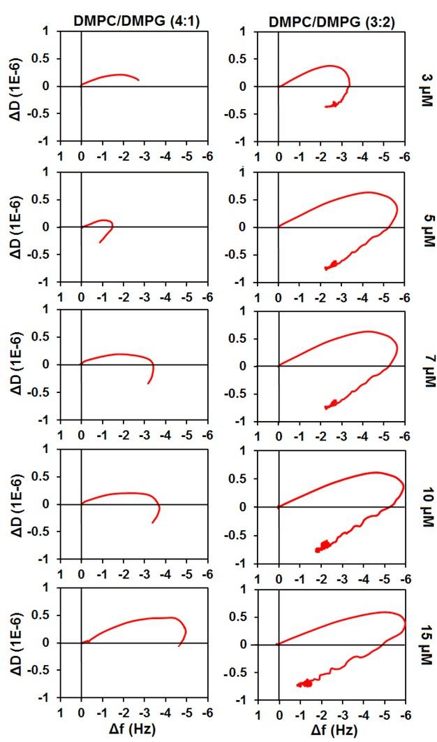 ΔD vs Δf plots of aurein1.2-NH-CH3 interaction with DMPC/DMPG (4:1) and DMPC/DMPG (3:2) at different concentrations. The effect is shown for the seventh harmonic of the fundamental frequency of the sensor chip.