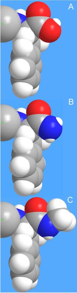 Comparison of the space filling models of the C-terminal region. The last residue (F13) is shown in full; the rest of the peptide is represented with an R group (large sphere in the figure). A) unmodified carboxyl terminus; B) primary amide (wild type) terminus; C) secondary amide with methyl terminus.