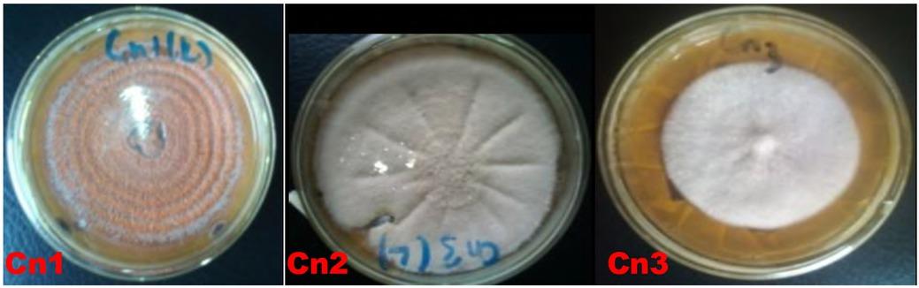 | Cn1 | Circular | Flat | Curled | Orange | Light orange | Slow/moderate | Slimy and moist | Septed | Micro conidia | 75 | Acremonium (15) |