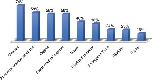 From the interview it was clearly evident that several organs were involved in the endometriosis, many of these were simultaneously present in the same patient. In figure 2, the percentage of involved organs.