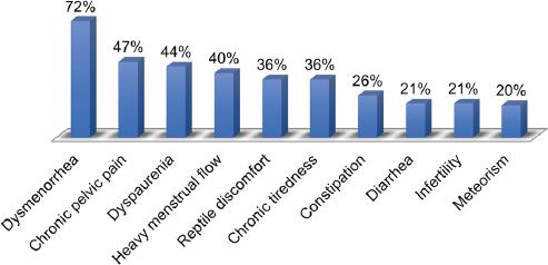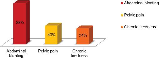 Unfortunately, the symptom that leads to the diagnosis of endometriosis is not strictly related to this symptom. In fact, almost half of women had a chronic pelvic pain (47%), dyspaurenia (44%) and heavy menstrual flow (40%). These are symptoms until today underestimated, that caracterises the majoruty of women affected by endometriosis. A discrete percentage of women affected by this disease showed reptile discomfort (36%), interpreted as false sensation of needing to defecate, rectal pain, discomfort to stay normally seated, sense of posterior heaviness. In addition, chronic tiredness is often neglected, even though it is a frequent symptom; 36% of women examined showed this symptom. Moreover, 26% of patients presented constipation, 21% diarrhea, 21% meteorism and flatulence phenomenon. Only 6% of patients were asymptomatic.