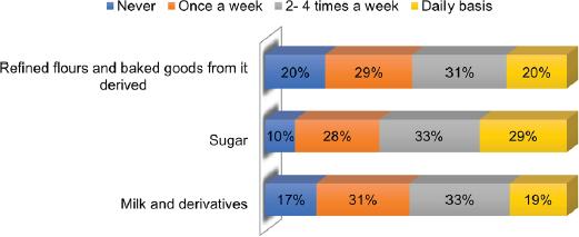 In the study we showed how milk and milk derivatives exacerbated the most painful condition (on 59% of patients) followed by sugar, refined flour and baked goods form it derived (on 50% of patients), by indicating that these nutrients might facilitate inflammation process (Fig. 6). Notably, 35% of patients ingested these nutrients 2-4 times a week. In the figure 6 it has been reported the consumption of each type of food during the week