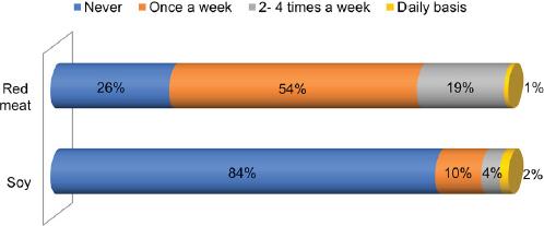 It is known that additional foods that contribute to pain conditions in endometriosis patients are soy and red meat. From the analysis of the responses it was highlighted that women had been alerted about this. In fact, most women did not consume soy and consumed red meat once a week (Fig. 7).