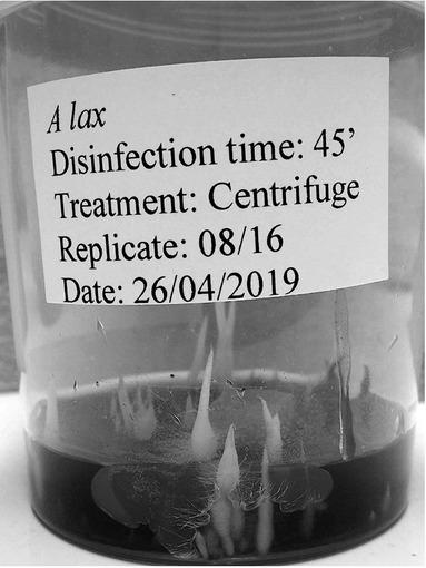 To test the influence of the disinfection method (that also serves as scarification) on seed disinfection and germination, combinations of three methods and nine durations (5, 15, 25, 35, 45, 55, 65, 75, and 85 min) were tested on seeds of Anacamptis laxiflora. The three disinfection/scarification methods to be described in detail are abbreviated as follows: (1) NaClO (soaking in NaClO solution), (2) CENTRIFUGE (soaking in NaClO solution, then centrifugation), and (3) PRESOAK (presoaking seeds in sucrose solution, then soaking in NaClO solution).