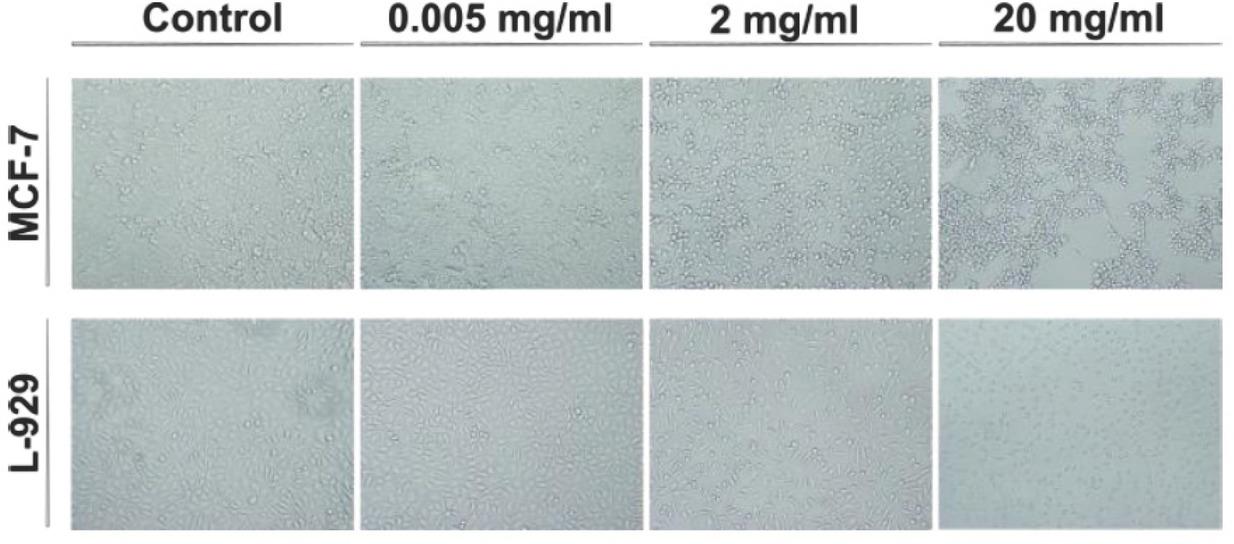 Phase-contrast microscope (x20) images of MCF-7 and L-929 cells treated with polyacrylic acid (PAA) at 0.005 mg/ml, 2 mg/ml, and 20 mg/ml of concentrations for 24 hours.
