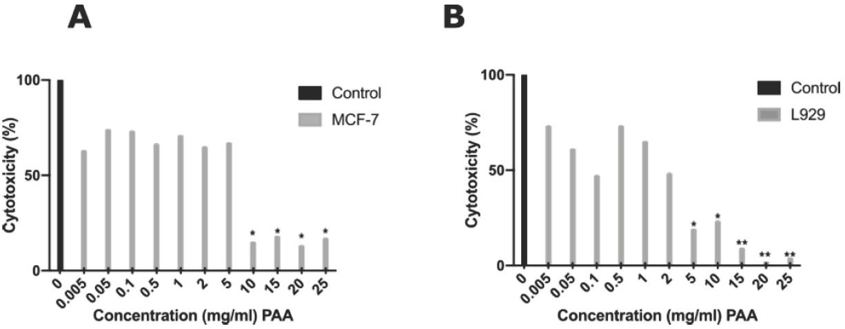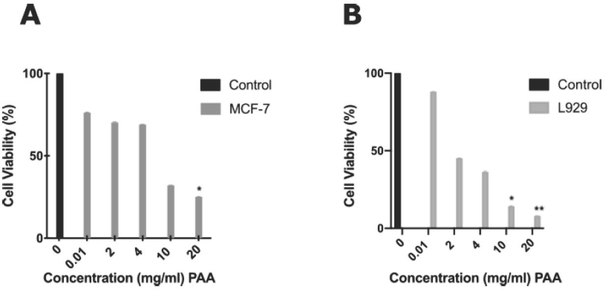 Different concentrations of PAA have a dose-dependent cytotoxic effect on MCF-7 and L-929 cells. PAA in high concentrations may inhibit the proliferation of breast cancer cells. In addition, PAA may activate the apoptosis pathway in cells in a dose-dependent manner. Therefore, PAA may be considered as a polymer agent in biomaterials to be used in breast cancer. In vitro and in vivo studies are needed to confirm the efficacy of PAA in breast cancer.