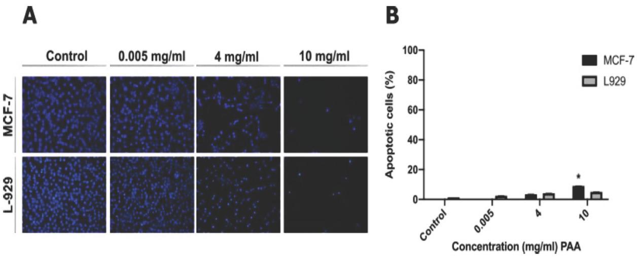 As a result of nuclear staining with DAPI, the nucleus of the MCF-7 cells (Control) was equal in volume and cell division was observed. No apoptotic body was detected (Figure 4A). Apoptotic body was significantly increased in MCF-7 cells treated with 10 mg/ml PAA compared to control (P < 0.05). On the other hand, the apoptotic body showed an insignificant increase in cells treated with 4 mg/ml PAA compared to the control (Figure 4B). The apoptotic body was observed in L-929 control cells (Figure 4A). It was determined that apoptotic body was insignificantly increased in PAA treated L-929 cells compared to control (Figure 4B).
