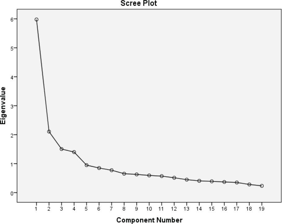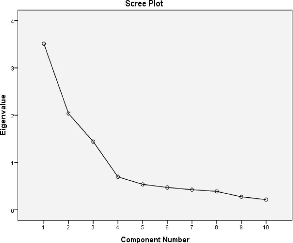 This could be further confirmed by the Scree plot (Figure 3) that confirmed that four factors have eigen values greater than one and that from the fifth factor onwards, all have given values less than one.