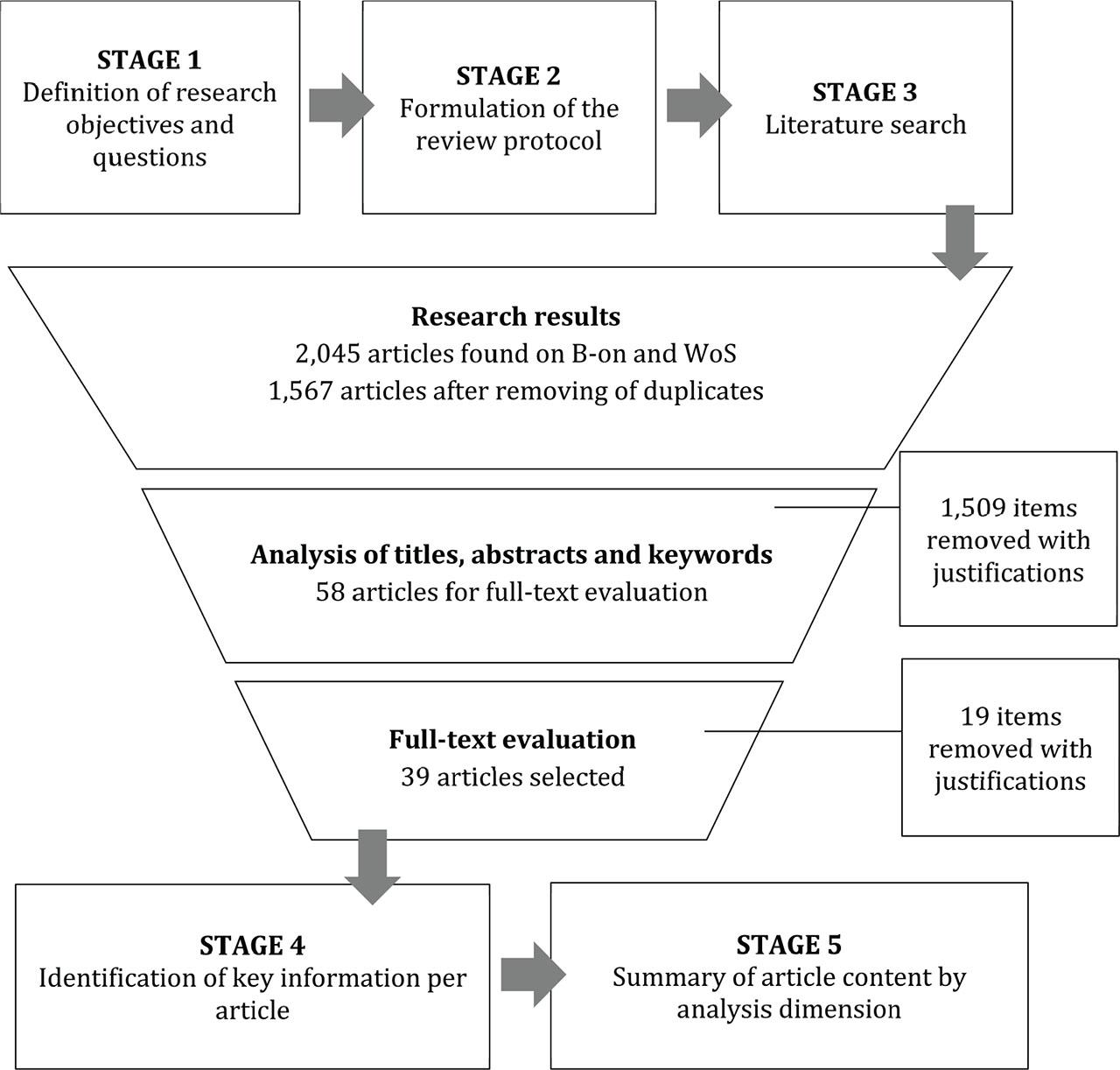On 31 May 2022, the search resulted in a total of 2,045 articles that met the established criteria and were imported into Mendeley, a reference management software. After excluding 478 duplicate records, 1,567 documents remained, as shown in Figure 1. Then, the title, abstract and keywords of these articles were read, leading to the exclusion of 1,509 articles because their content did not fit the purpose of this study and did not allow for answering the research questions. After this process, 58 articles were left for full-text evaluation.