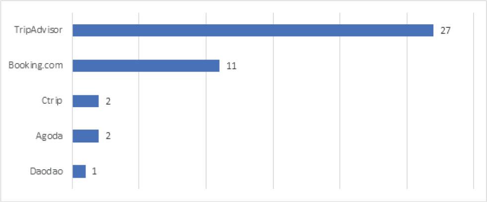 In 27 studies, data were extracted from TripAdvisor (Figure 3), the largest online hotel review platform in the world and widely investigated by the academic community (Banerjee & Chua, 2016; Hu et al., 2019), and in 11 investigations the Booking.com platform was selected, and it was indicated as a suitable source to ensure the authenticity of the extracted data, since only customers who book through Booking.com can publish reviews after their stay (Xu et al., 2017).