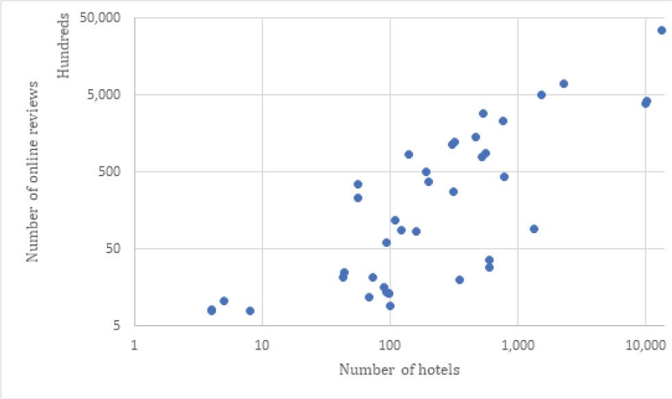 Number of hotels and number of online reviews per article