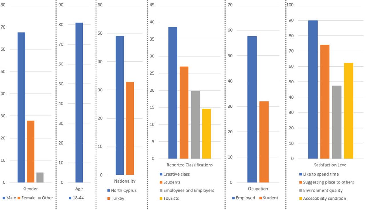The study aimed to outline the societal context of the Kyrenia waterfront and assess satisfaction with it as a creative space. The questionnaire, comprising four components, started with demographics, followed by gauging satisfaction with the waterfront's development and principles. It concluded by describing consumer satisfaction with innovative waterfront features (Appendix A).