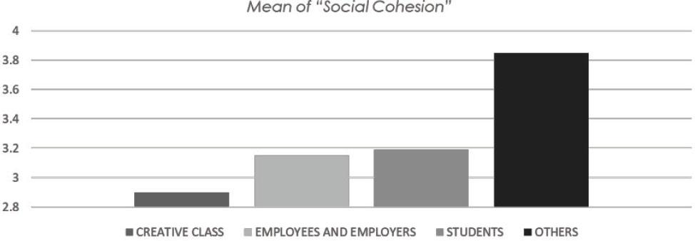 A post-hoc Tukey HSD test showed which groups of users differ significantly in the social cohesion variable. These results demonstrated that between creative individuals (p<0.05), employees, and employers (p<0.10), as well as between students (p<0.10) and other groups of users, there are significant differences in the social cohesion variable.